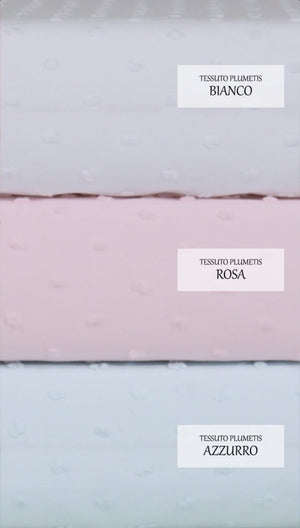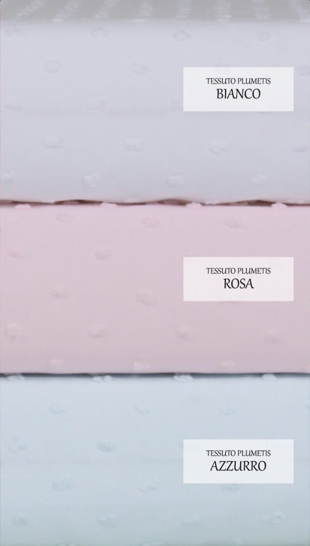 TESSUTO: cotone ecrù e plumetis azzurro con fascione centrale e pendente centrale in plumetis bianco