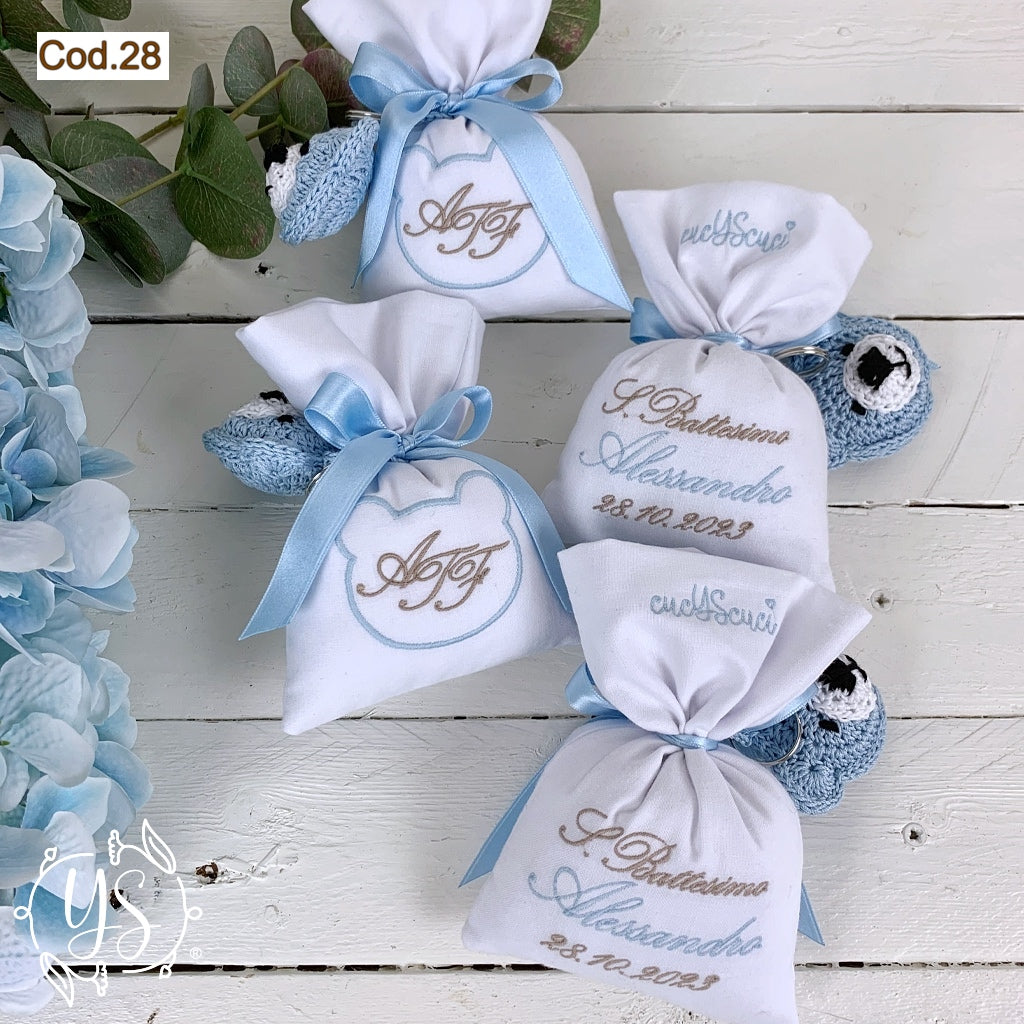 Tessuto cotone bianco, ricamo fronte e retro azzurro e beige, nastro azzurro in tinta al ricamo con orsetto portachiavi all'uncinetto.