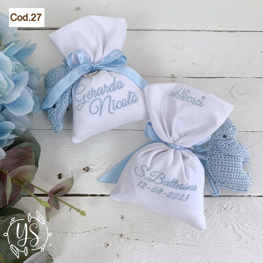 Tessuto cotone bianco, ricamo fronte e retro azzurro, nastro in tinta al ricamo con elefantino portachiavi all'uncinetto.