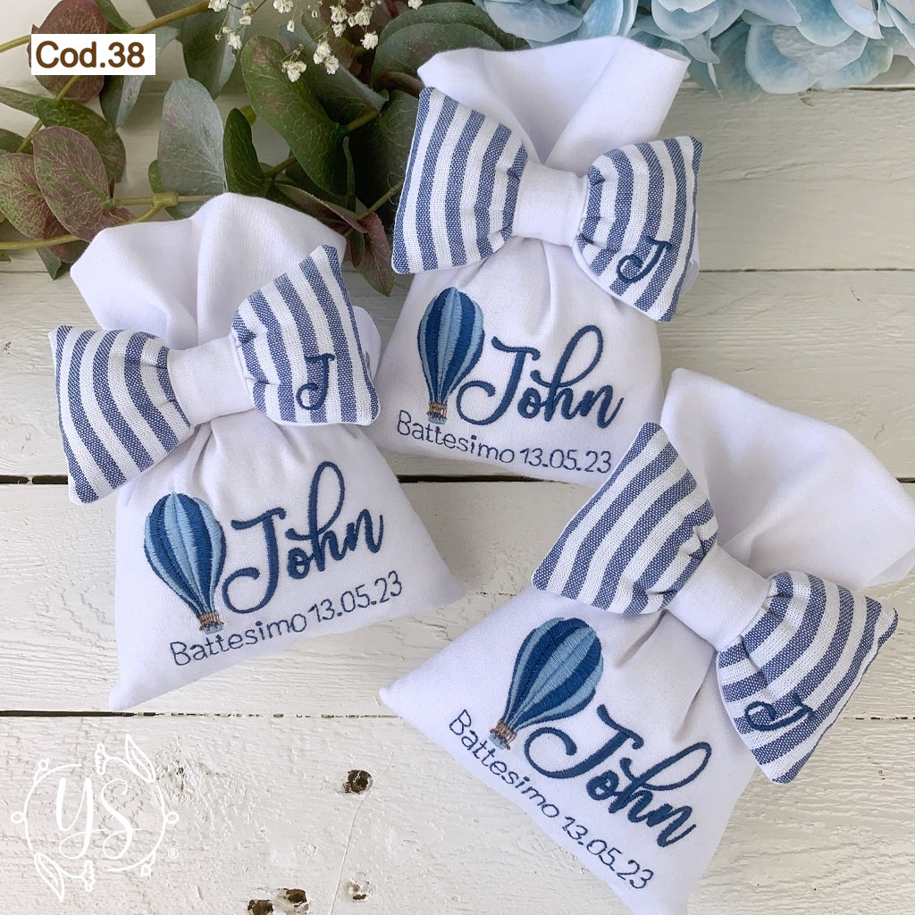 Sacchettino porta confetti in misura standard 11x15 cm circa, tessuto cotone bianco, ricamo mongolfiera nei toni del blu, con 5 confetti alla mandorla a scelta tra azzurri, rosa o bianchi.