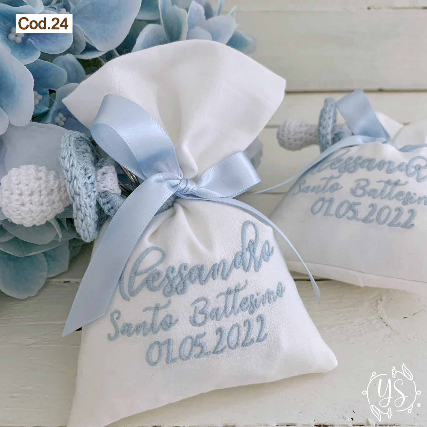 Tessuto cotone bianco, ricamo azzurro, nastro in tinta al ricamo e ciuccio portachiavi all'uncinetto.