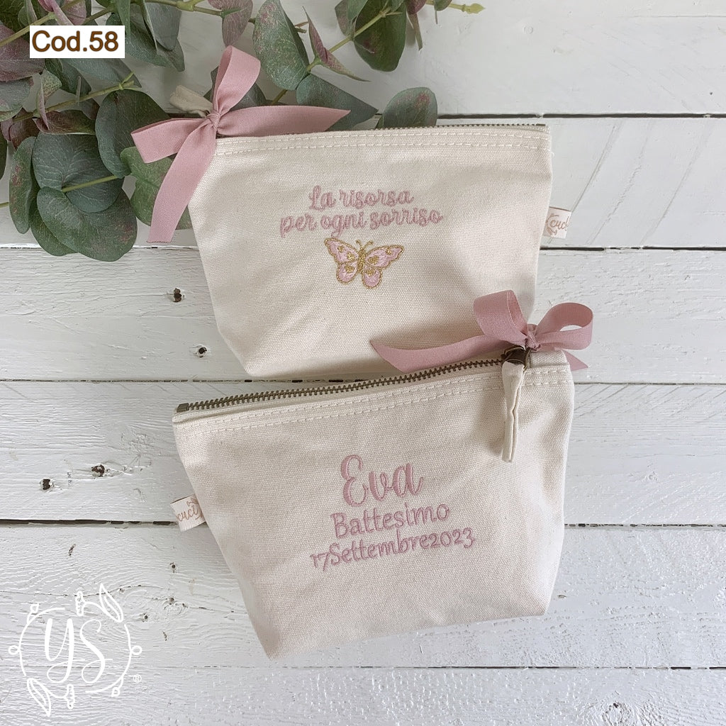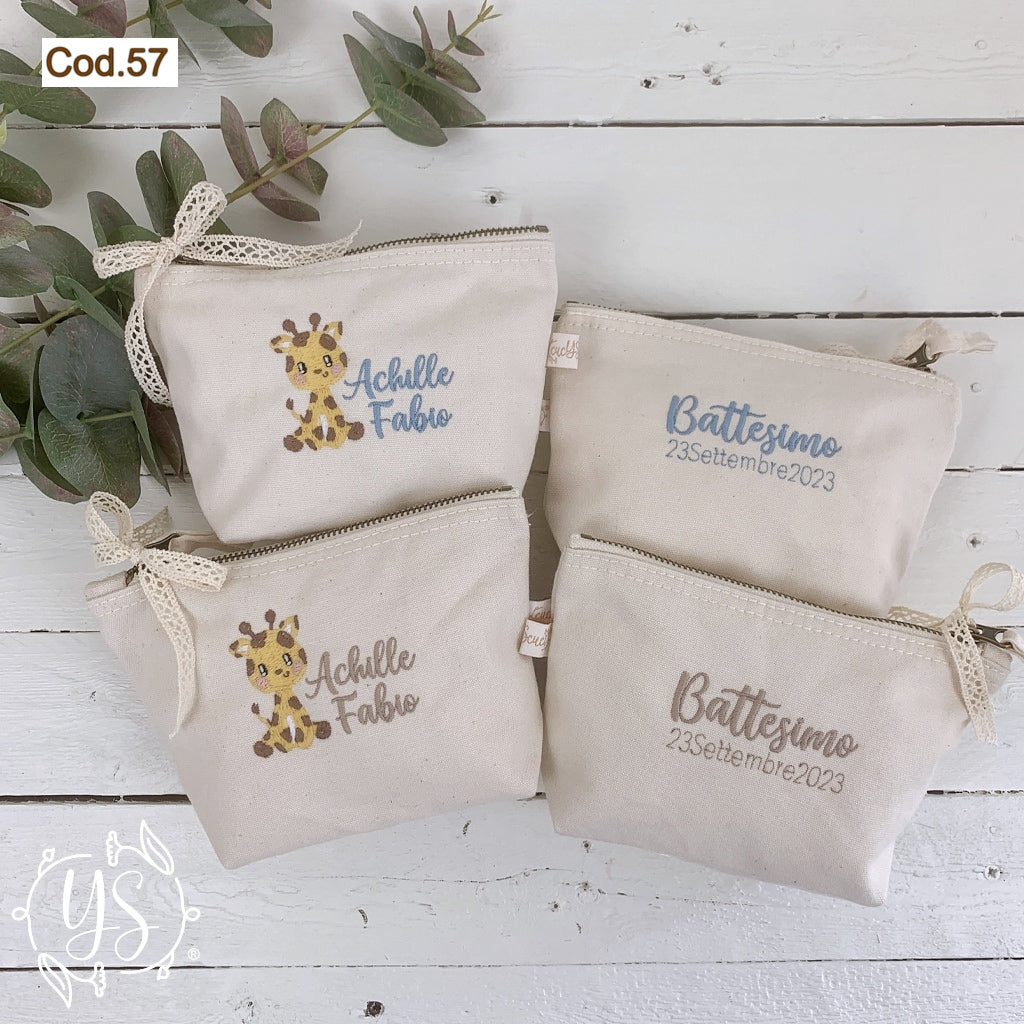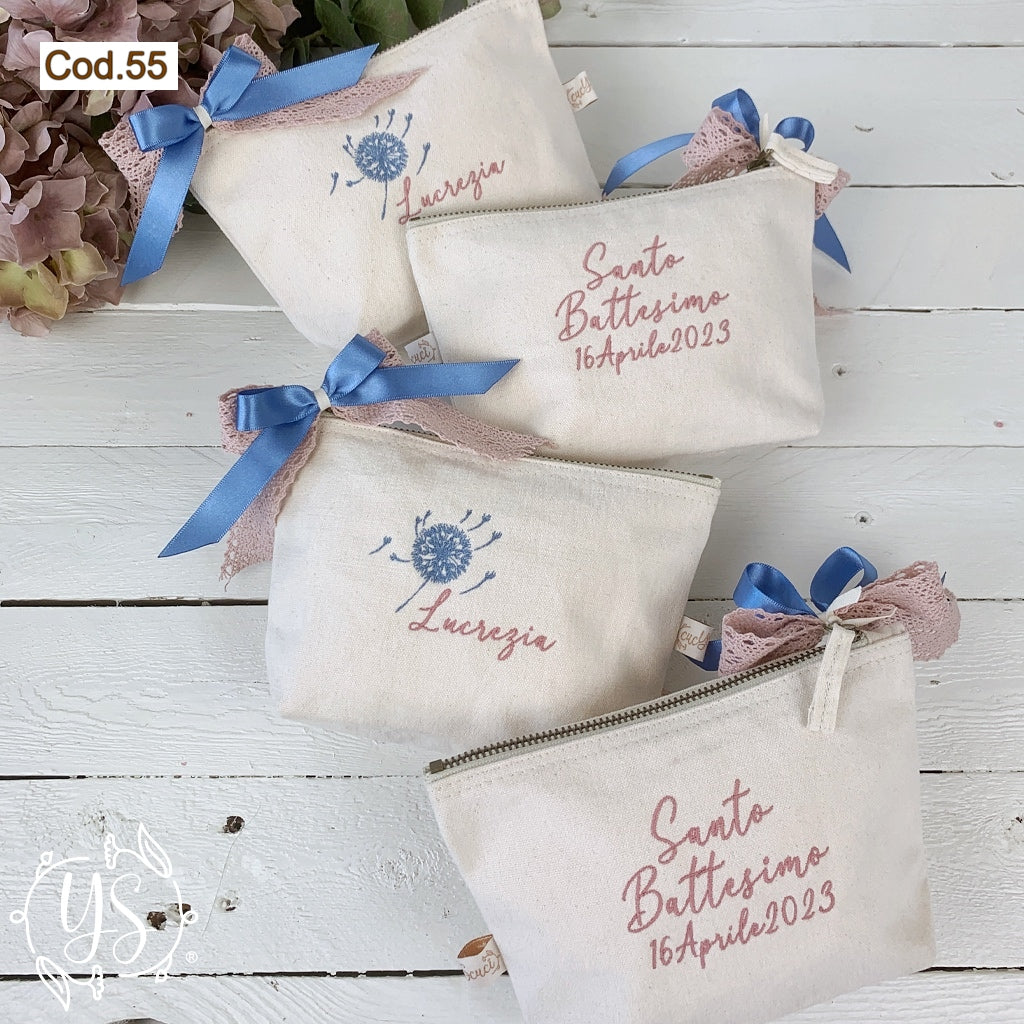 Pochette trapezio panna o bianca in misura standard 18x12x6 cm circa, confezionato con 5 confetti alla mandorla a scelta tra azzurri, rosa o bianchi.