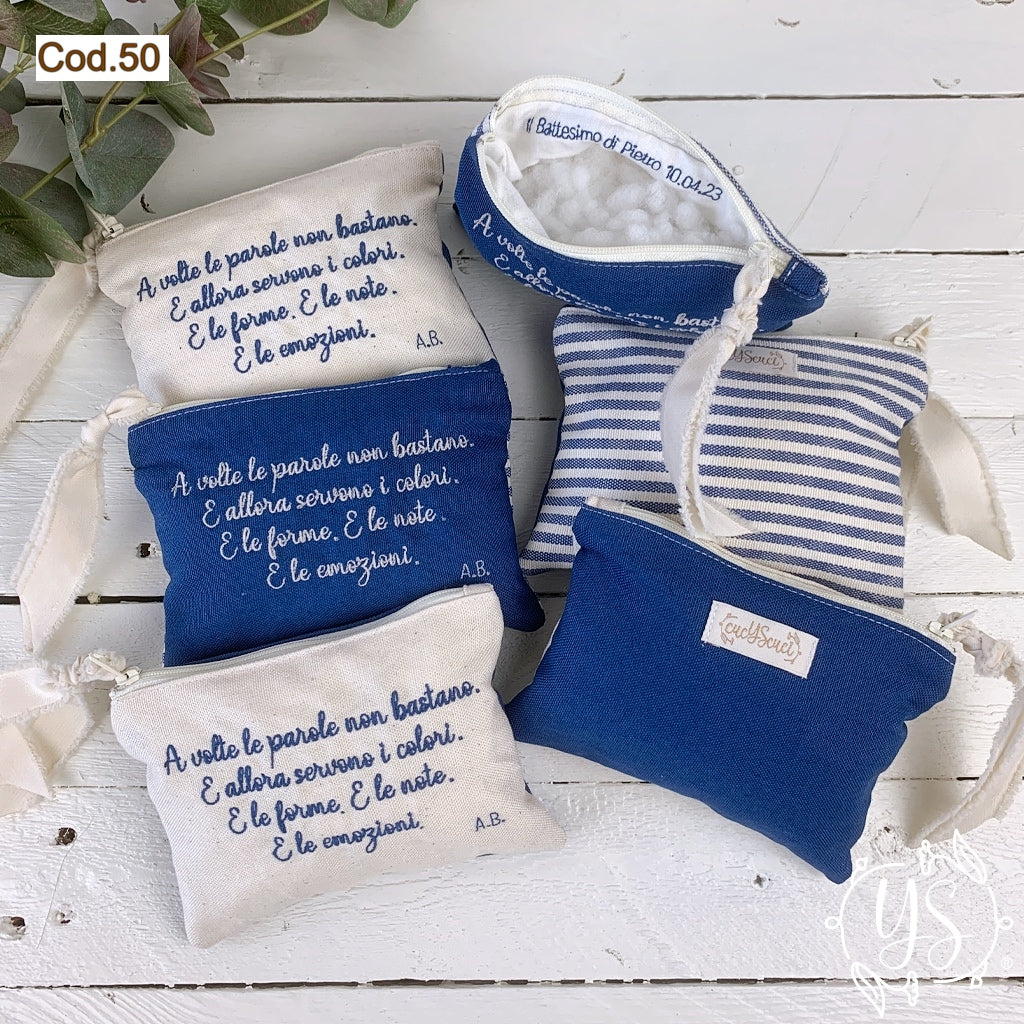 Tessuto cotone purgato azzurro (39C) da un lato e cotone purgato panna (33C) dall'altro lato, con interno bianco latte. Ricamo citazione esterna color panna e ricamo interno in azzurro, con nastrino sul cursore sfrangiato panna.