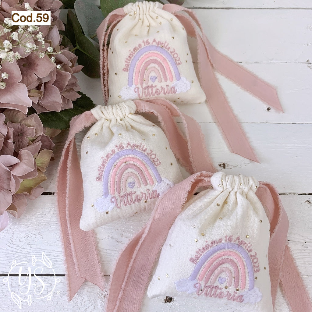 Tessuto in mussola panna a pois oro (14M), ricamo arcobaleno nei toni del rosa e nastro in cotone sfrangiato rosa in tinta al ricamo.