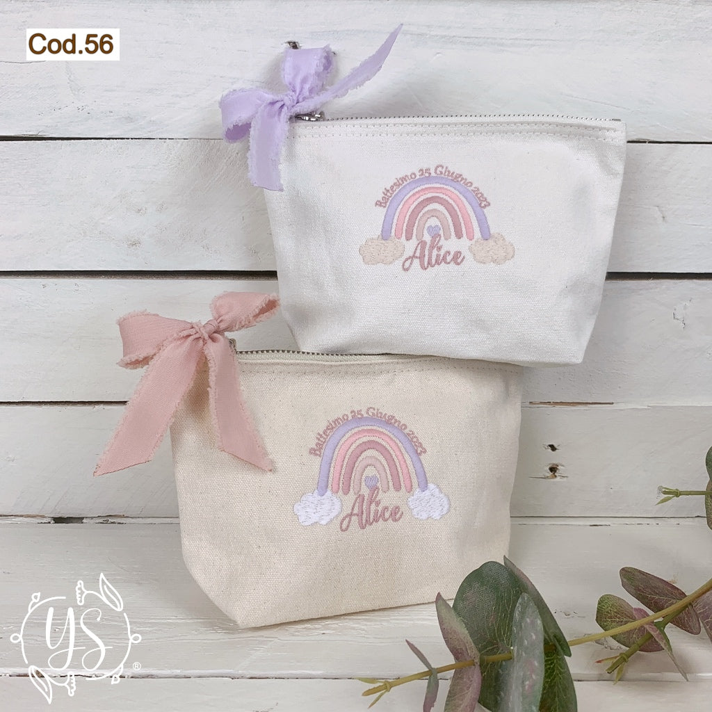 Tessuto cotone organico panna o bianco, ricamo disegno arcobaleno nei toni del rosa con fiocco sul cursore sfrangiato rosa o lilla.