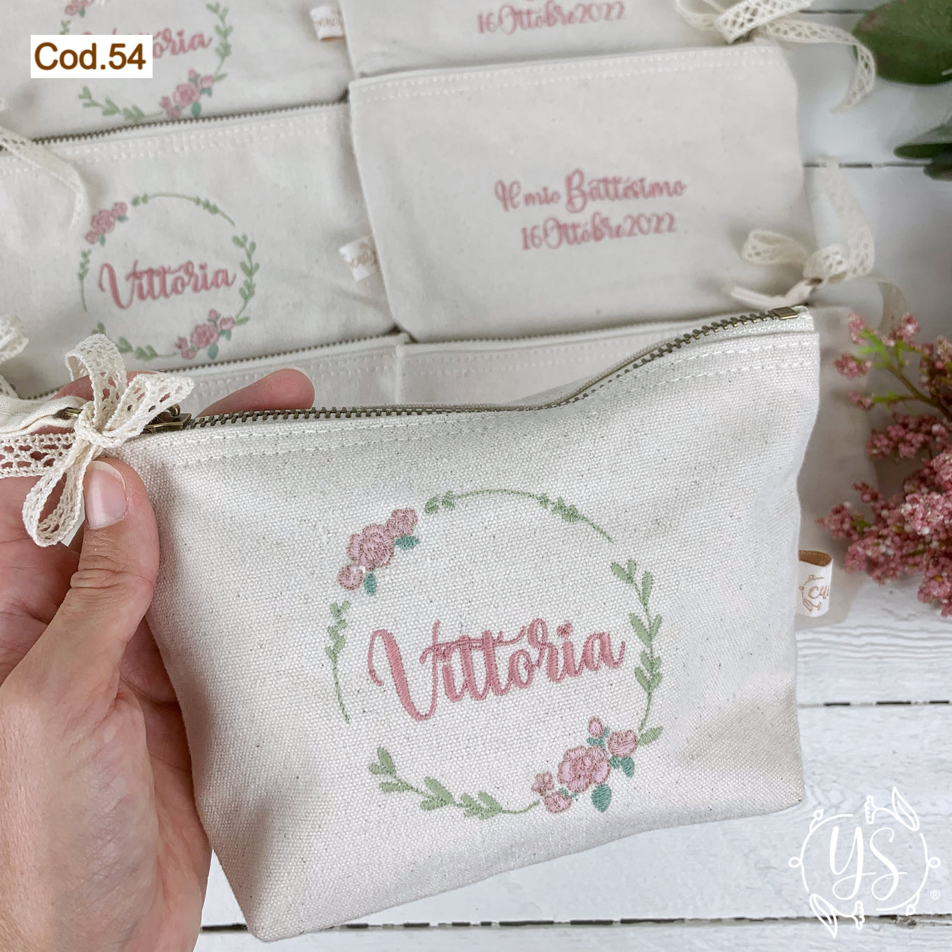 Tessuto cotone organico panna, ricamo ghirlanda con nome sul davanti e ricamo dietro nei toni del rosa marsala con fiocco in pizzo panna sul cursore.
