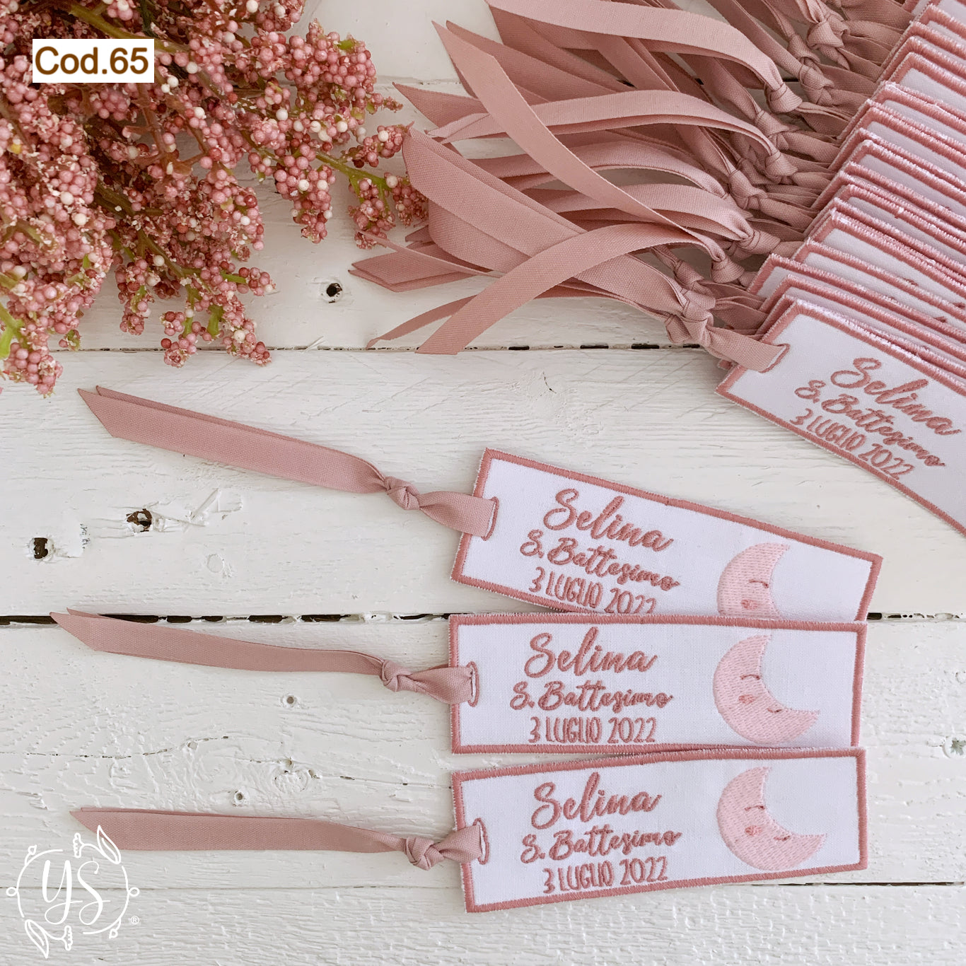 Tessuto cotone bianco, ricamo luna in rosa e nastro rosa marsala in tinta al ricamo.