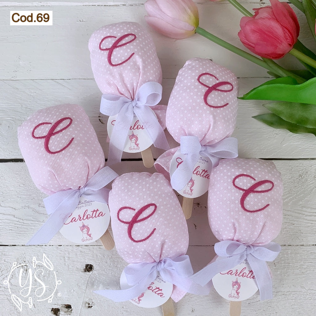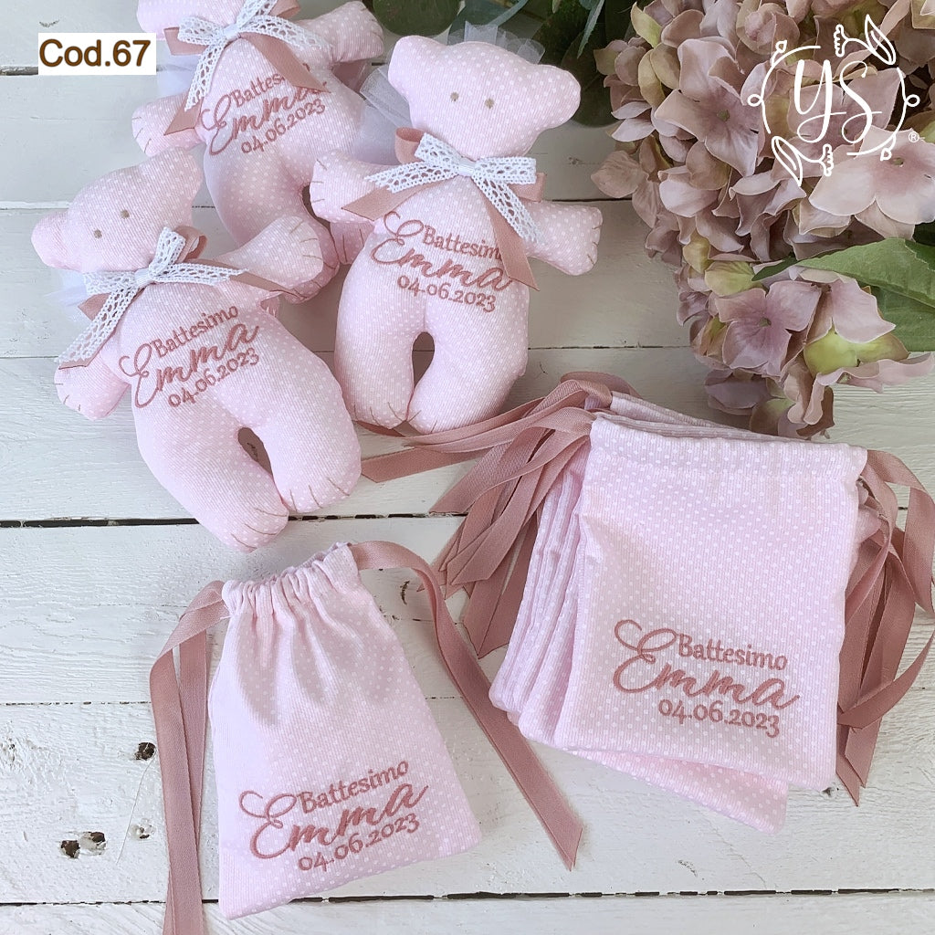 Tessuto cotone piquet rosa a pois (11P), ricamo iniziale fucsia e nastro in cotone bianco.