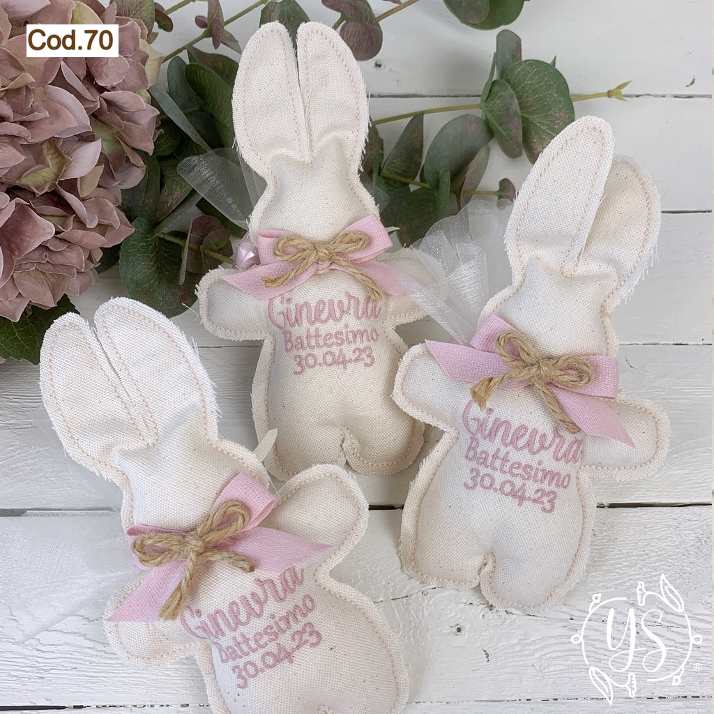 Coniglietto in misura standard 20x11 cm circa, confezionato con 3 confetti alla mandorla a scelta tra azzurri, rosa o bianchi.