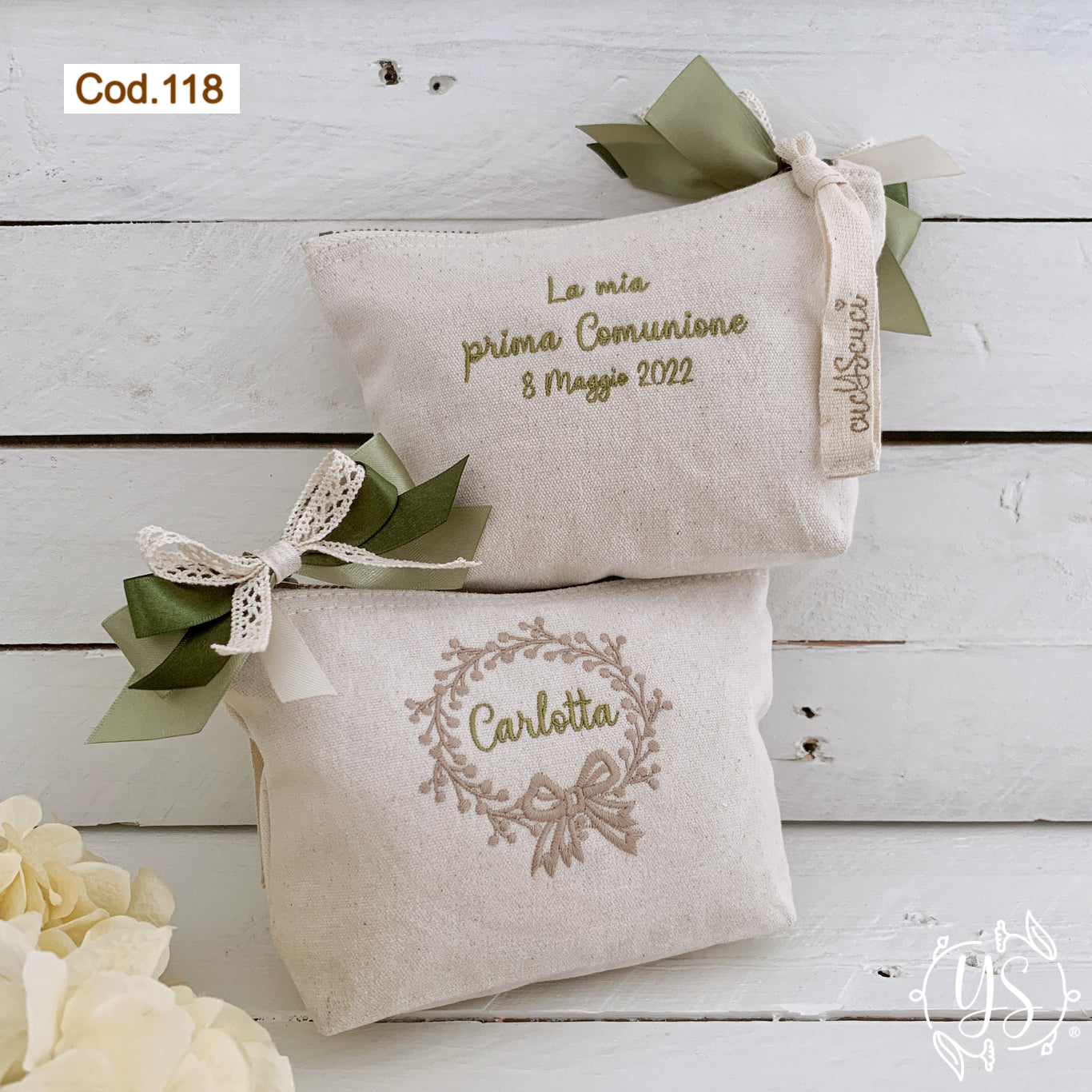 Tessuto cotone organico panna, ricamo ghirlanda con nome sul davanti e ricamo dietro, nei toni del beige e verde oliva con triplo fiocco in pizzo panna, raso verde e verde scuro sul cursore.