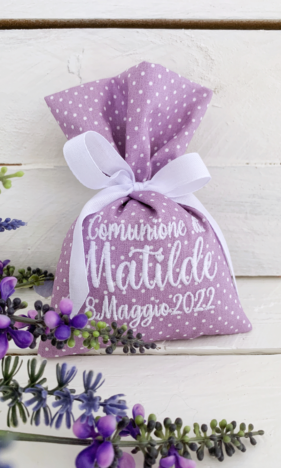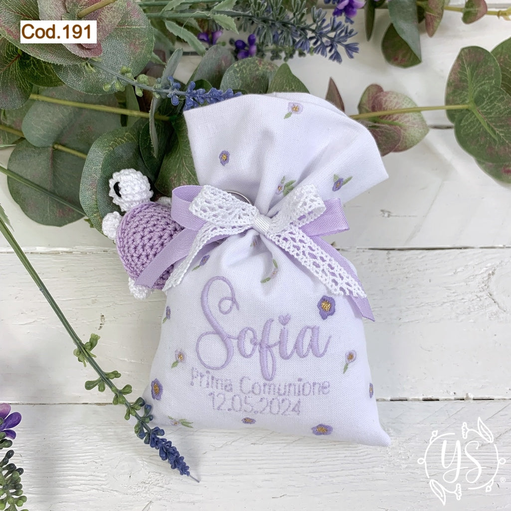Ricamo fiorellini nei toni del lilla diffuso su tutto il sacchetto, con scritte lilla in tinta al nastro.