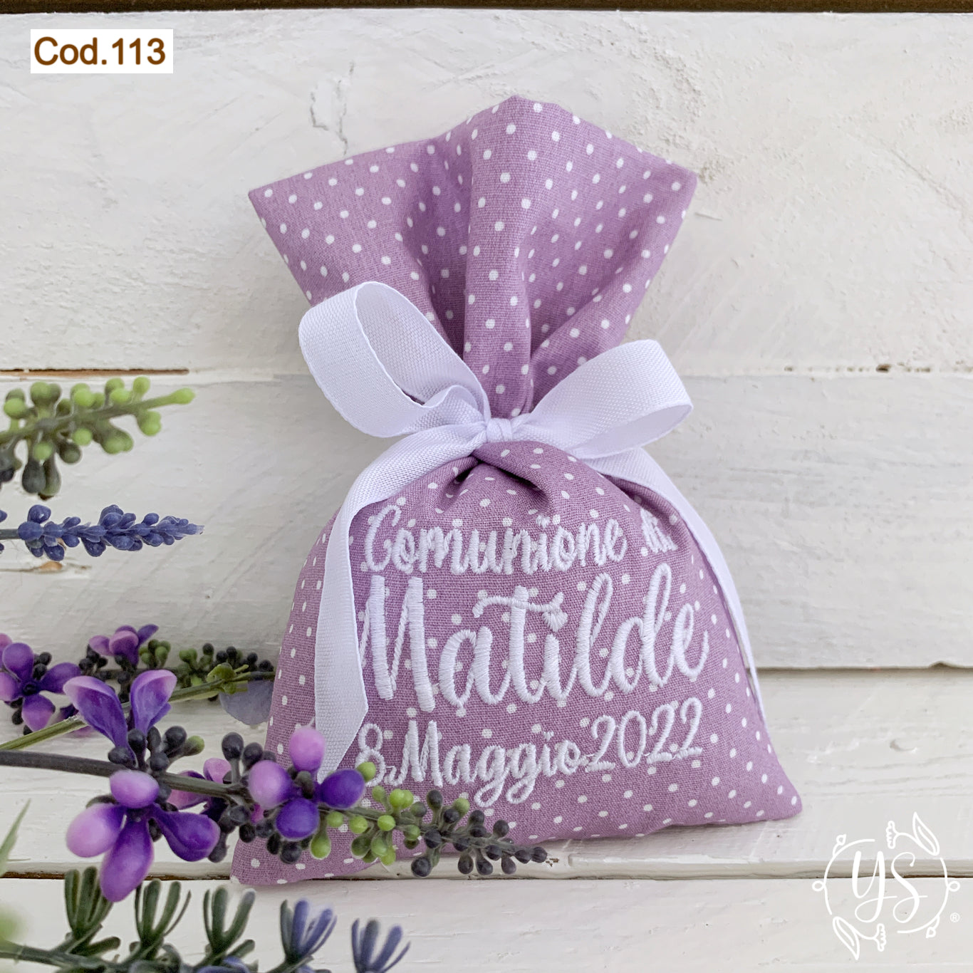 Tessuto cotone viola a pois bianchi (44C), ricamo bianco e nastro bianco in tinta al ricamo.