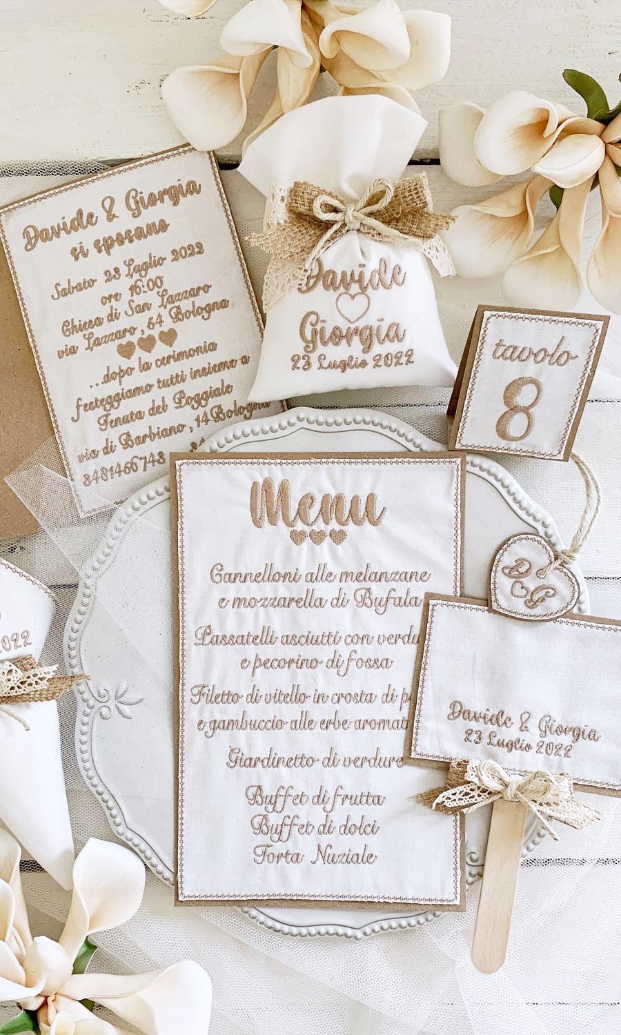 Rendi il tuo giorno speciale ancora più memorabile con le nostre bomboniere esclusive e cuscini portafedi ricamati personalizzati. Il nostro obiettivo è quello di trasformare il tuo matrimonio in un'esperienza unica, arricchita di dettagli raffinati e personalizzazioni su misura.