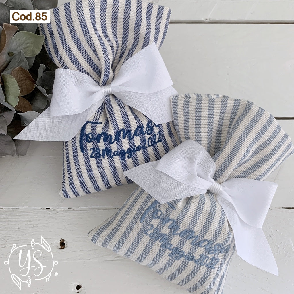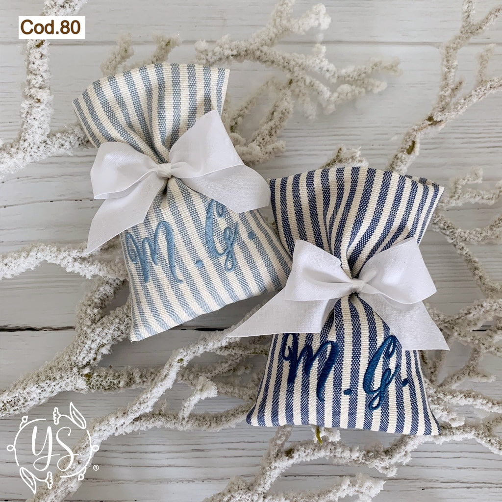 Tessuto cotone robusto a righe azzurre e blu (9RB/8RB), ricamo azzurro e blu in tinta alla stoffa con nastro in cotone bianco.