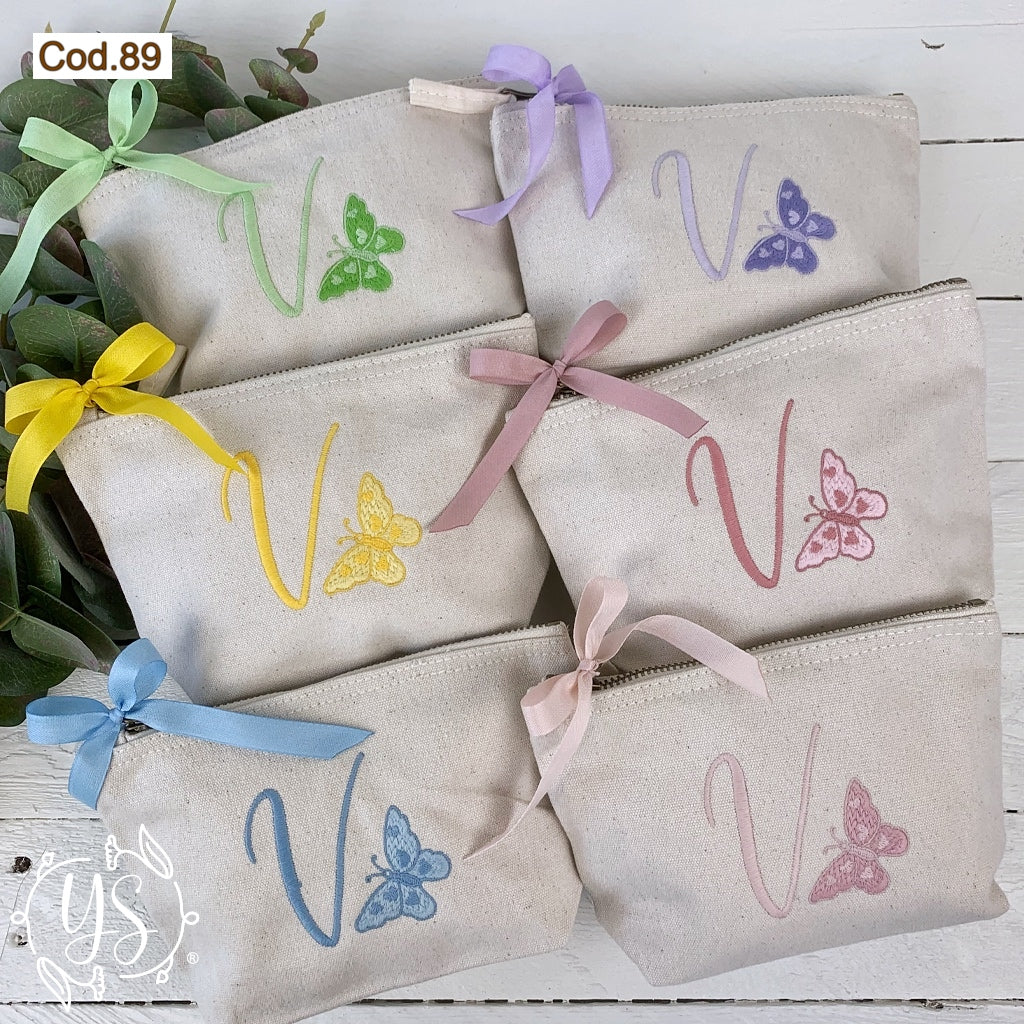 Tessuto cotone organico panna, ricamo iniziale e farfalla con nastro in tinta al ricamo sul cursore.