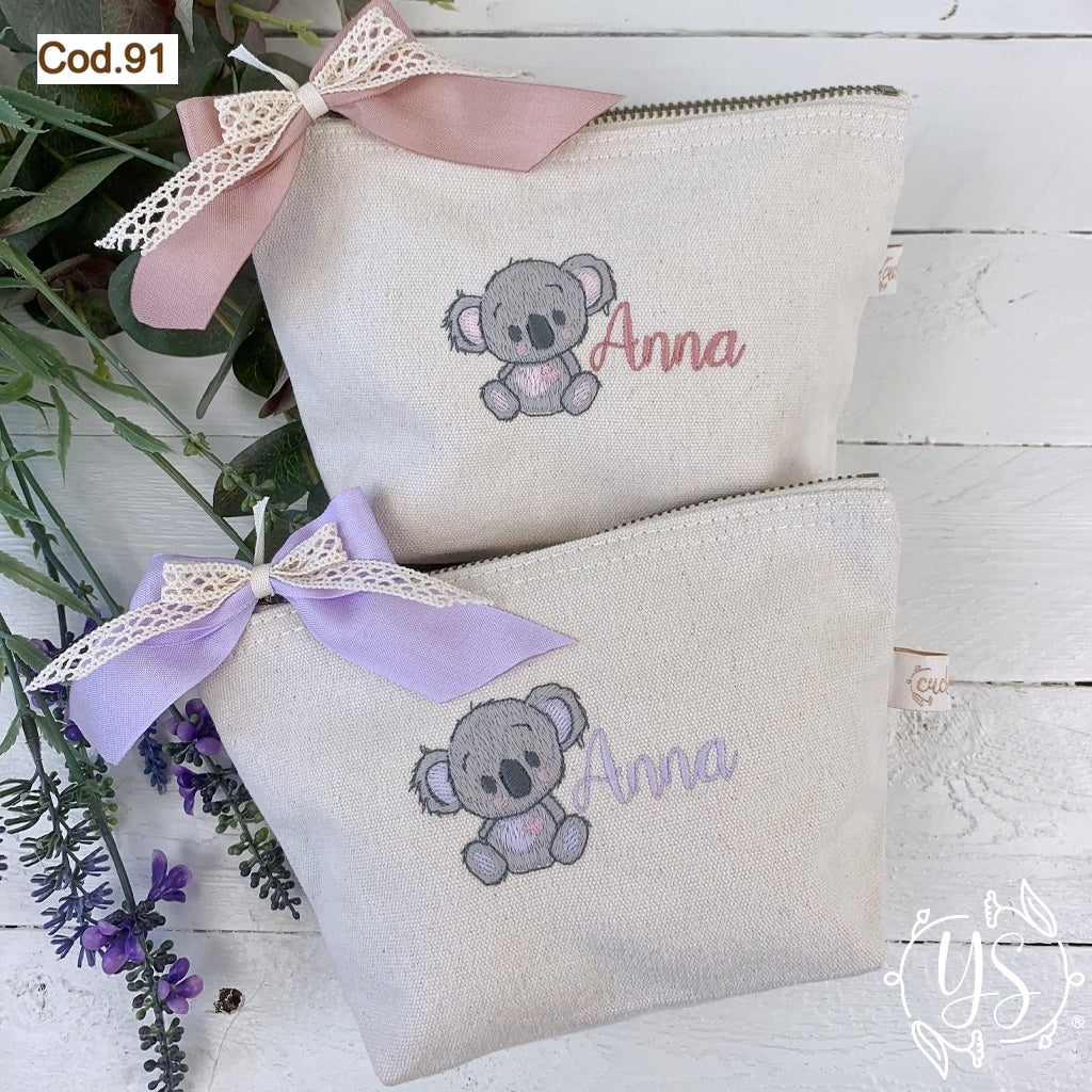 Tessuto cotone organico panna, ricamo koala nei toni del rosa marsala e lilla con doppio nastro in pizzo panna e in cotone in tinta al ricamo.