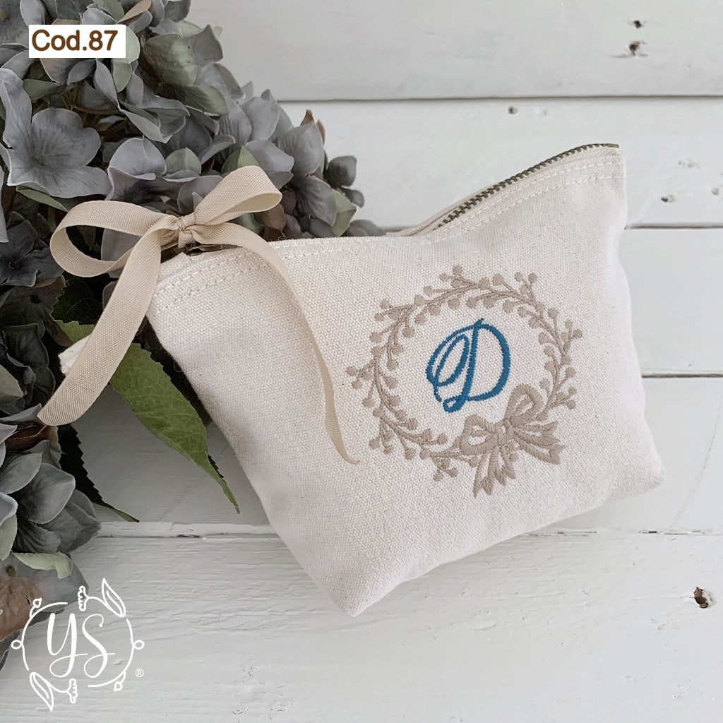Tessuto cotone organico panna, ricamo ghirlanda beige con iniziale blu al centro. Fiocco in cotone beige sul cursore in tinta al ricamo.